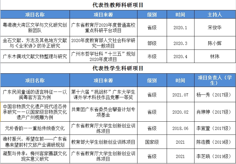 2016年,永利集团3044欢迎你成立了“教育部人文社科重点研究基地永利集团3044欢迎你非物质文化遗产研究中心新华学院工作站”,教师团队继续在区域文学与文化研究方向深耕细作。2020年6月,“中国古代文学”评为校级重点学科,该学科以古代文学的现代传承为切入点,服务地方文化建设,凝练为非物质文化遗产研究、地方文献与传统诗文、广东戏曲与俗文学三个方向。