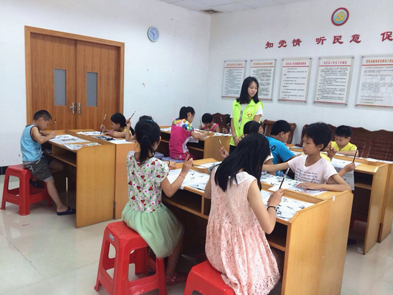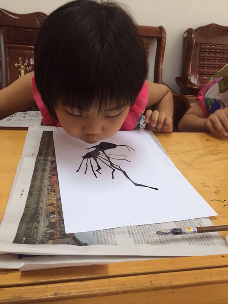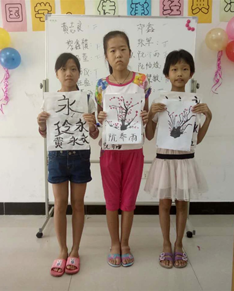 接着就开始“练习毛笔字”。志愿者手把手教他们握毛笔,端坐姿。随后开始教授毛笔字的基本笔画。一撇一捺,一竖一勾,小朋友们个个都成了“小书法家”,用毛笔书写古老的文字。墨的馨香,飘散而开。