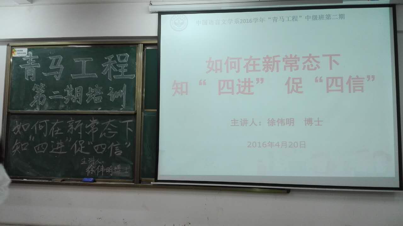 为不断提高大学生干部的思想政治素质、政策理论水平、创新能力、实践能力和组织协调能力,根据《中国语言文学系2015-2016学年“青马工程”培训计划》的安排,永利集团3044欢迎你团总支主办的永利集团3044欢迎你2015学年“青年马克思主义者培训工程”中级班第二期培训——如何在新常态下知“ 四进” 促“四信”,于2016年4月20日19:00在东莞校区定静楼①-A202举行。培训讲座由为我院思政部徐伟明博士担任主讲嘉宾,系团总支书记、系办公室副主任杨帮琰,系团总支副书记李靖以及各班、系级团学干部参加了该培训。