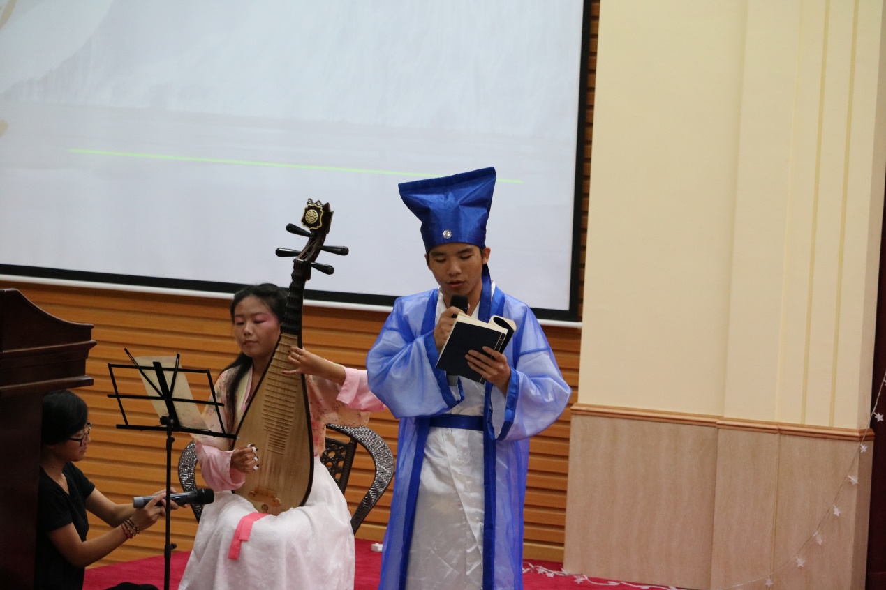 接着是专场演出的预热节目——当吟诵遇上琵琶。吟诵是古代读书人的读书方法——读书皆吟诵。古典乐器是古代读书人表达情感的重要方式——古人琴不离身,有如良友。诗以言志,乐以修身。13级的李文杰同学先用吴川话深情吟唱了《清明》,接着以普通话吟唱屈原的《山鬼》,仿佛引领我们穿越时空,回到古代,身临其境感受古人的文艺气息。