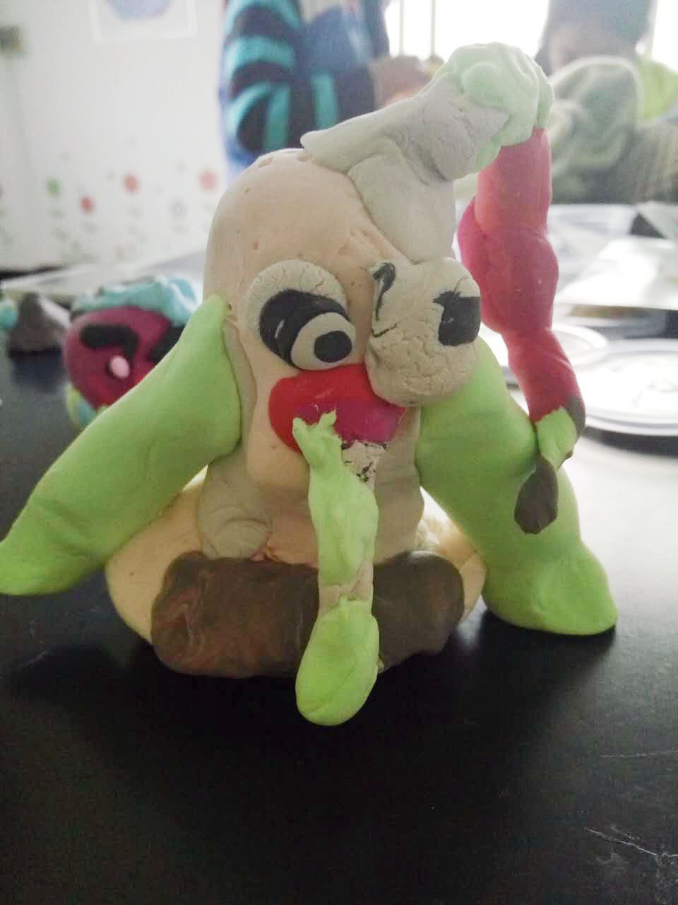 那就是用轻粘土做出各种小玩意啦!当看见一盒盒五颜六色的轻粘土时,小朋友的眼睛都亮了,纷纷挑选自己喜欢的颜色的粘土,拿起小工具,马上进入状态啦!又是一场想象力和动手能力的PK,小朋友完成好的作品将会放在一起进行评比,大家都兴奋了起来。