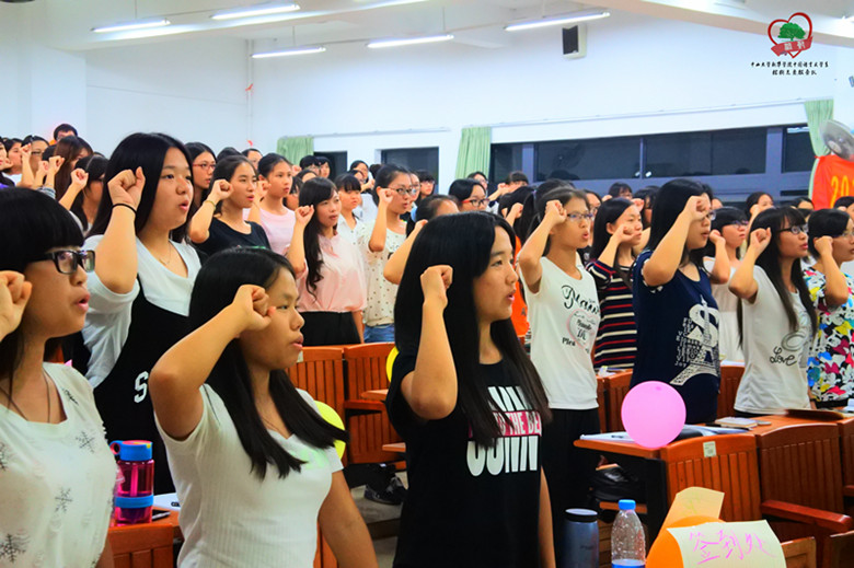 图8 全体志愿者高举右拳,面向队旗,庄严宣誓:“我志愿加入中国语言文学系榕树志愿服务队”