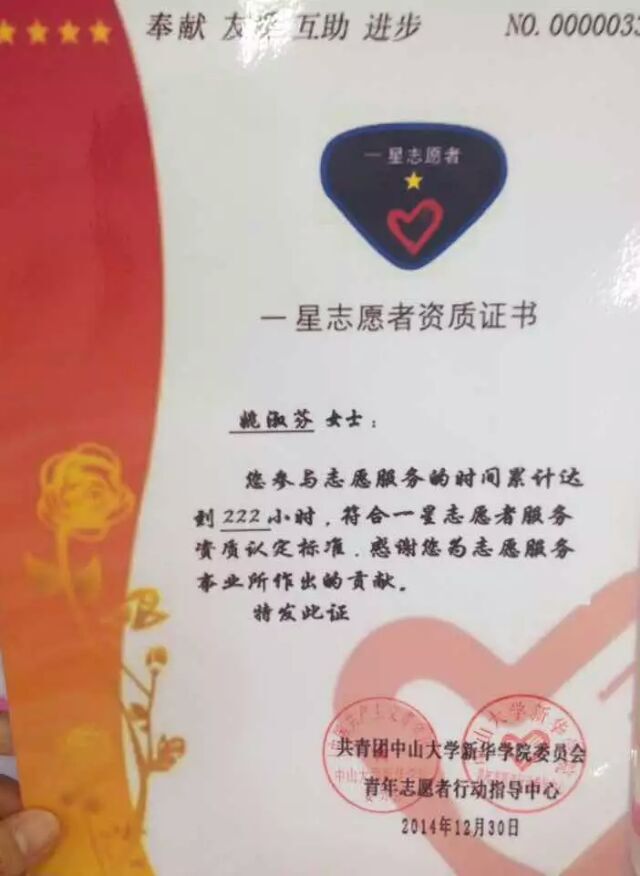 近日,从院团委青年志愿者行动指导中心获悉,经过审核评议,我系陈卓香(11级,104小时)、郭晓芳(11级,108小时)、姚淑芬(13级,222小时)、陈珊珊(13级,140.5小时)等4人被评为2014年广东省“一星志愿者”。