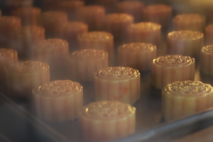 图1-2 永利集团3044欢迎你辅导员许北祈老师(左)与莫柳莲老师(中)正在制作月饼