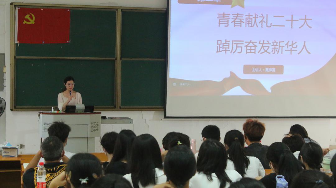 学生第二党支部书记莫柳莲带领新生学习党的二十大精神内容