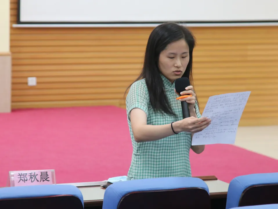 郑秋晨老师进行点评。她表示,各位选手的展示异彩纷呈、感人至深。多数选手对作品熟悉透彻,音乐、道具、画面都很用心。选题上比较丰富,有古有今;创设情境,带领观众入文入境入情;古今对话的形式新颖;重视仪容仪态。后续的决赛准备中,要注意停顿和重音的表达,以确保字正腔圆。郑老师还表示此次比赛加强了小组的合作精神,给各位选手都带来了锻炼。
