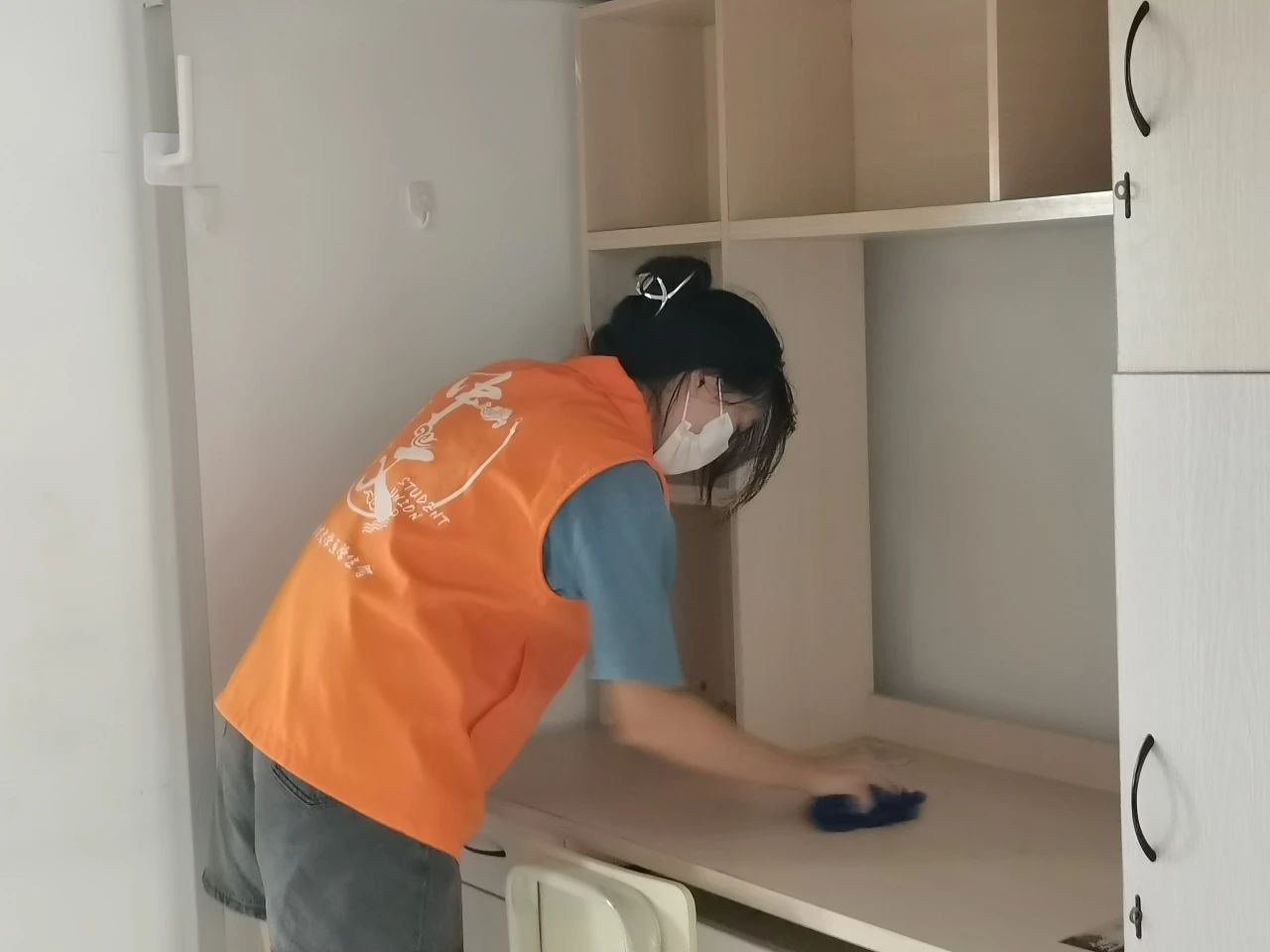 将镜头对准新生宿舍,映入眼帘的是永利集团3044欢迎你学生会工作人员和志愿者逐一排查了宿舍硬件设施,对地面进行了细致的清洁,书桌和衣柜的里里外外也被擦拭干净。