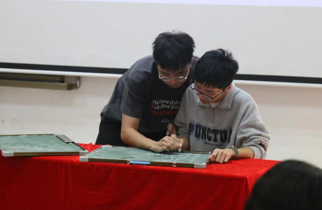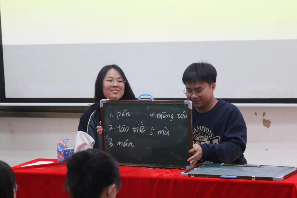 最后一轮比赛项目是成语题,参赛选手们跃跃欲试,都想要和彼此一决高下。此项目同样需要两位参赛选手上台参赛,其中一人在确认考题后,需在规定时间内仅通过动作向另一人尽可能正确传达词语含义,使其能够在小黑板上写下正确答案,最后由评委老师根据所写正确词语的数量进行评分。