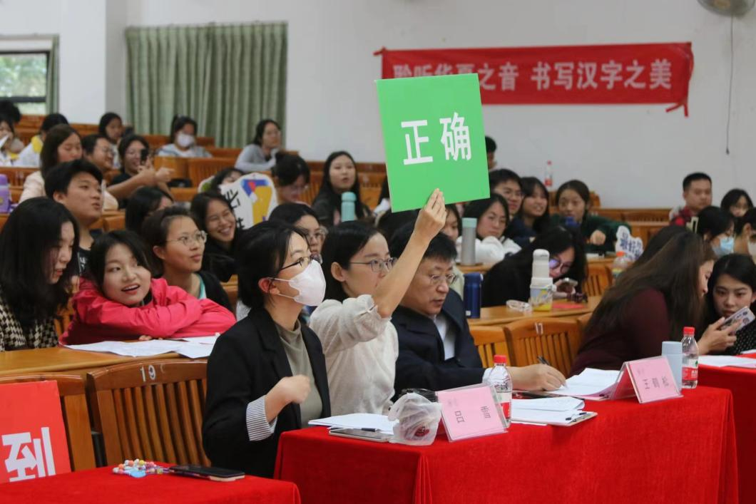 第二轮比赛项目是正字正音题,与前一项目不同的是,这一项目添加了一个听音正字的流程,选手需要在规定时间内同时通过听和看在小黑板上写下正确答案,然后由评委老师进行评分。这既增加了比赛难度,同时又为枯燥的赛事增添了些许趣味性。