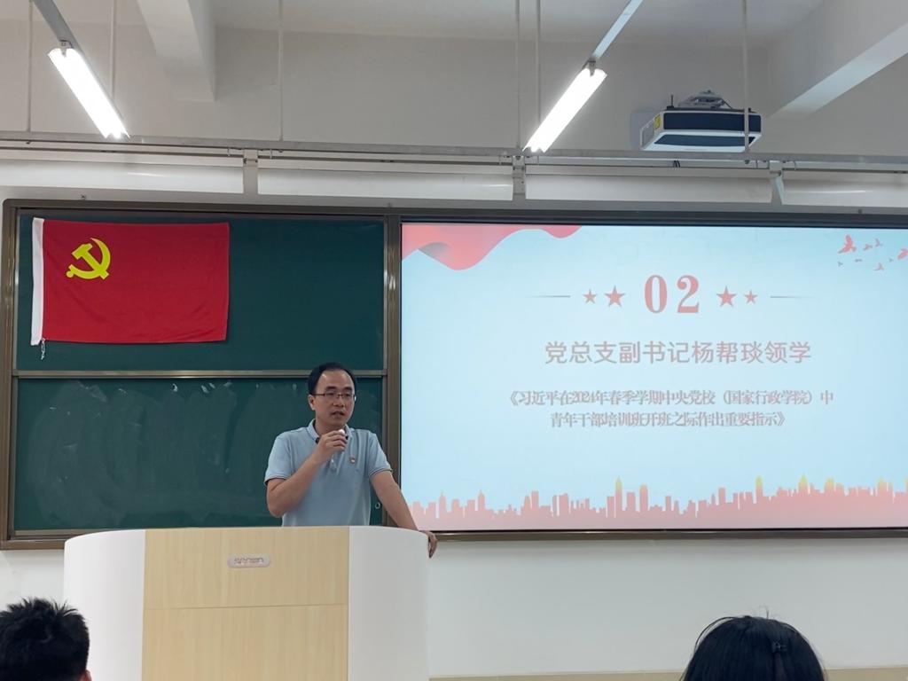 随后,副书记杨帮琰领学“第一议题”《习近平在2024年春季学期中央党校(国家行政学院)中青年干部培训班开班之际作出的重要指示》。他强调,“年轻干部是党和国家事业发展的生力军,是中国特色社会主义事业的接班人。新征程上,年轻干部重任在肩、大有可为,必须牢记初心使命、顽强拼搏进取,奋力跑好历史的接力棒。”广大党员要做到“五要”,即“要自觉做党的创新理论的笃信笃行者”,“要自觉做对党忠诚老实的模范践行者”,“要自觉做矢志为民造福的无私奉献者”,“要自觉做勇于担当作为的不懈奋斗者”,“要自觉做良好政治生态的有力促进者”,“永葆共产党人清正廉洁的政治本色”,成长为“堪当强国建设、民族复兴重任的可靠接班人”。并希望毕业生党员和其他党员,在学校本科评估、毕业生就业等方面,始终与学校、系保持步调一致,作出积极的贡献。