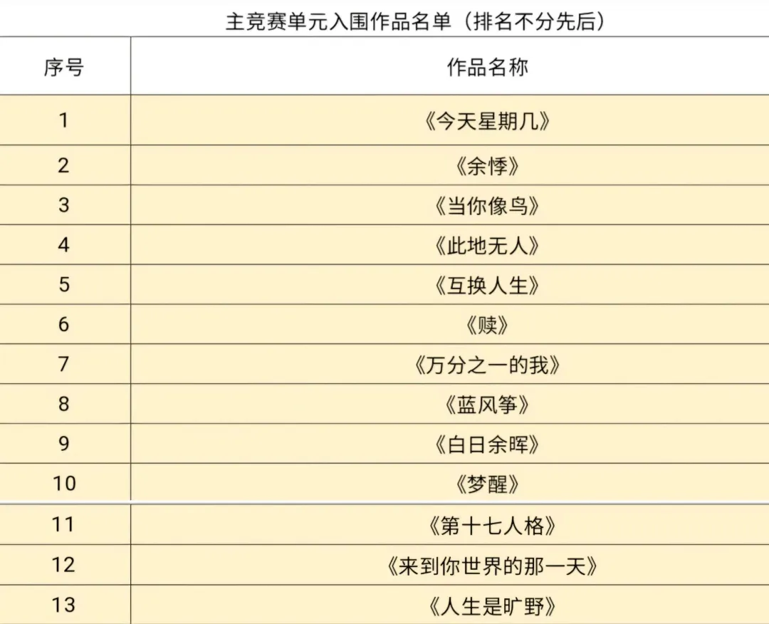 全部普通赛道入围的13部作品以及红色赛道6部作品