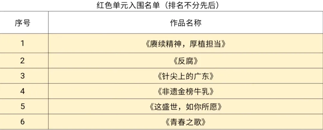 红色单元由专家评审团直接负责初评,评分标准同“主竞赛单元”初评标准,经专家初评,有6个红色作品入围本单元决赛。