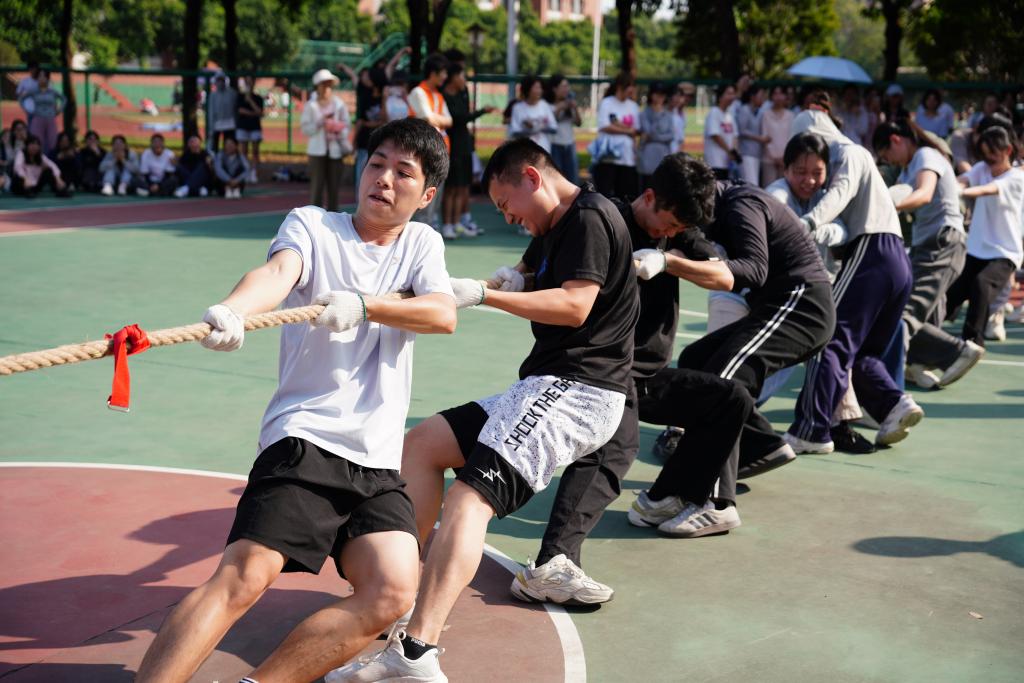 到了运动会下午,迎来了我系的两人三足和拔河比赛。这是一次考验团体合作的比赛,象征着班级的智慧与荣誉。下午两点,两人三足比赛正式开始,参赛的运动员们在阳光下相互协调、一同前进,最后一起奔向终点,迎接胜利的曙光。待两人三足比赛结束后,激动人心的拔河比赛正式开始。上场前,各个班级的运动员们已商量好拔河策略,纷纷戴上手套,摩拳擦掌,跃跃欲试。随着裁判的哨声吹响,双方开始发力,大声喊起口号,旁边的同学与老师一同加油助喊。经过多次比拼,拔河比赛正式收尾。