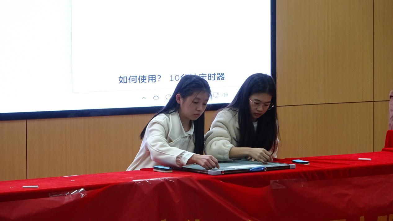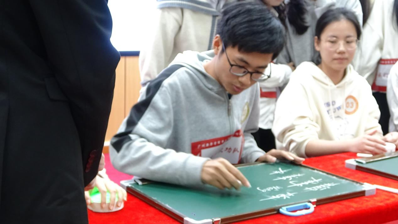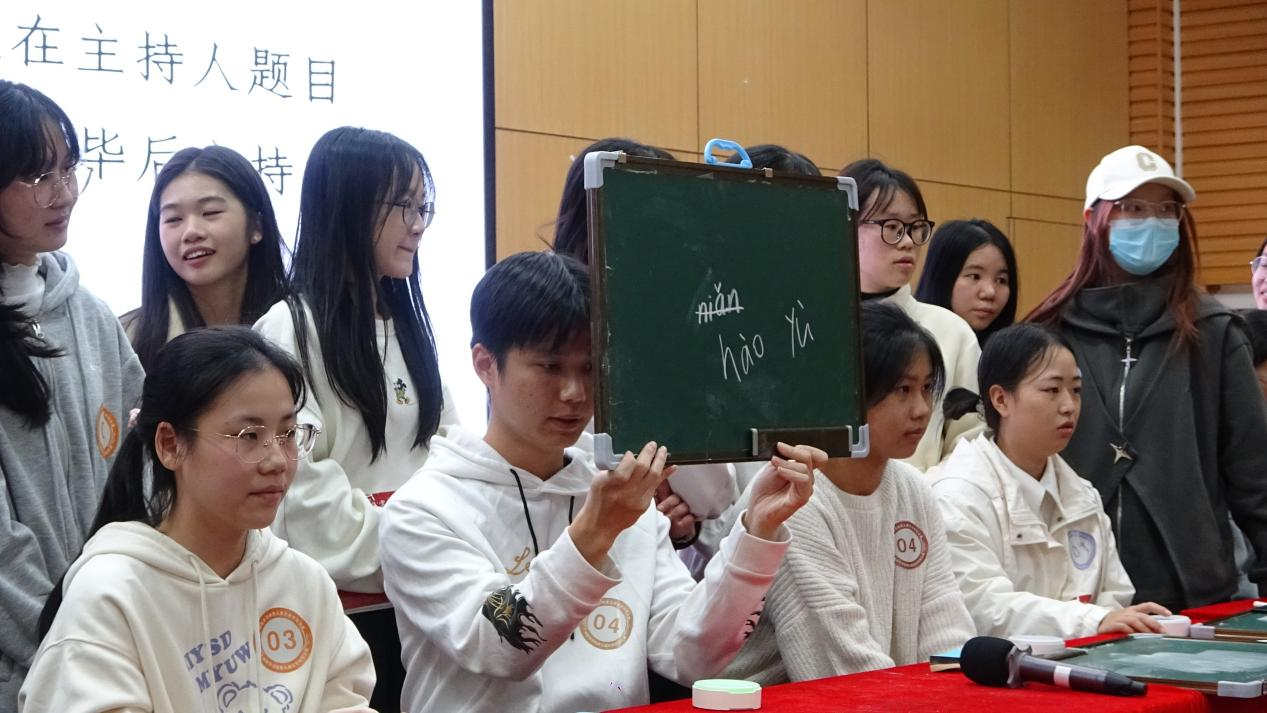第三轮为“你画我猜”题,4人赛。本轮每组限时5分钟。A同学看到小黑板上展示的成语后,通过动作传递给B同学,B同学根据动作指示,将成语答案写在黑板上。作答完毕后,评委判断题目正误,主持人宣读该队伍所答对的正确题目数量。
