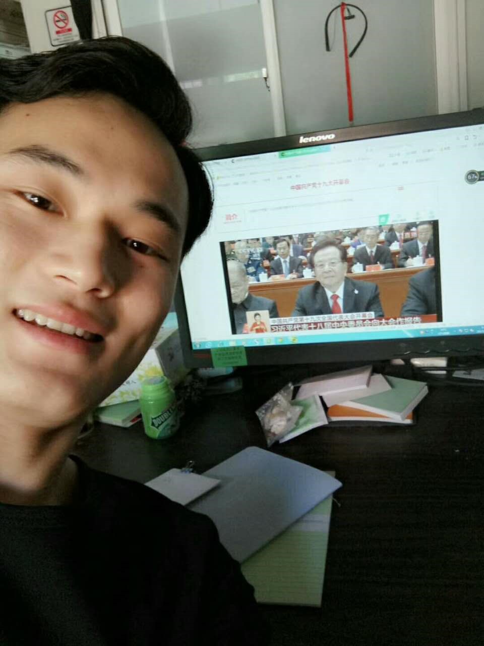 图七.我系14级学生黄雍善在实习单位深圳市福田区莲花街道办事处收看十九大开幕会报告