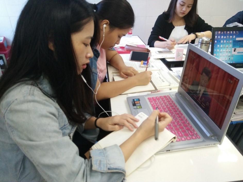 图三.我系学生党员14级林诗祺、入党积极分子龚丽婷在实习单位广州市卓越里程教育科技股份有限公司收看十九大开幕会报告