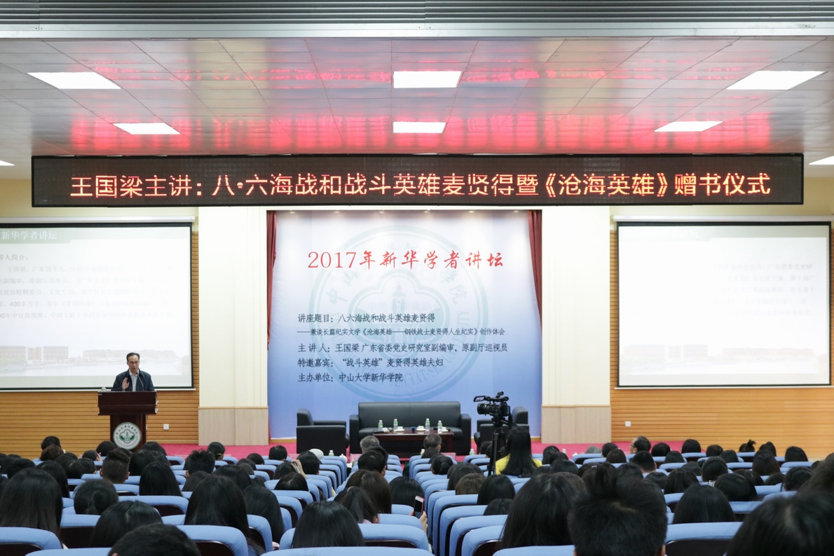 12月27日,麦贤得英雄夫妇应刘婉莉董事兼校长助理的邀请亲临我校东莞校区与新华学子面对面聊忆当年事、爱国情。同日,广东省委党史研究室副编审,原副厅巡视员,《广东党史》杂志原主编,第十届广东省政协特聘委员、文史专员王国梁同志携其书写麦贤得英雄光辉事迹的长篇纪实小说《沧海英雄》走进中山大学新华学院,为新华学子讲述英雄故事。本次讲座由中山大学新华学院主办,中山大学新华学院学科与科技管理处、中国语言文学系党总支、中国语言文学系团委承办,校学生处、党委学生工作部(合署办公)、校团委、马克思主义研究部、军事理论教研室、永利集团3044欢迎你学生党支部协办,旨在激发我校学生爱国热情、振奋民族精神、凝聚社会力量。麦贤得英雄夫妇受邀出席讲座,中山大学新华学院王庭槐校长、许淑锐副校长、刘婉莉校助等校领导,学校学科与科技管理处张玲处长和永利集团3044欢迎你夏茵英副主任、李铭建副主任携新华师生向英雄学习和致敬。下午3时整,麦贤得英雄携夫人缓缓步入会场,在场全体师生自发起立鼓掌,表达了新华师生对英雄的高度敬意。