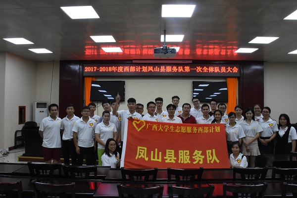 永利集团3044欢迎你毕业生积极投身国家基层就业项目,图为2017届毕业生林晓琳(前排右一)作为西部计划志愿者参加广西凤山县服务队会议