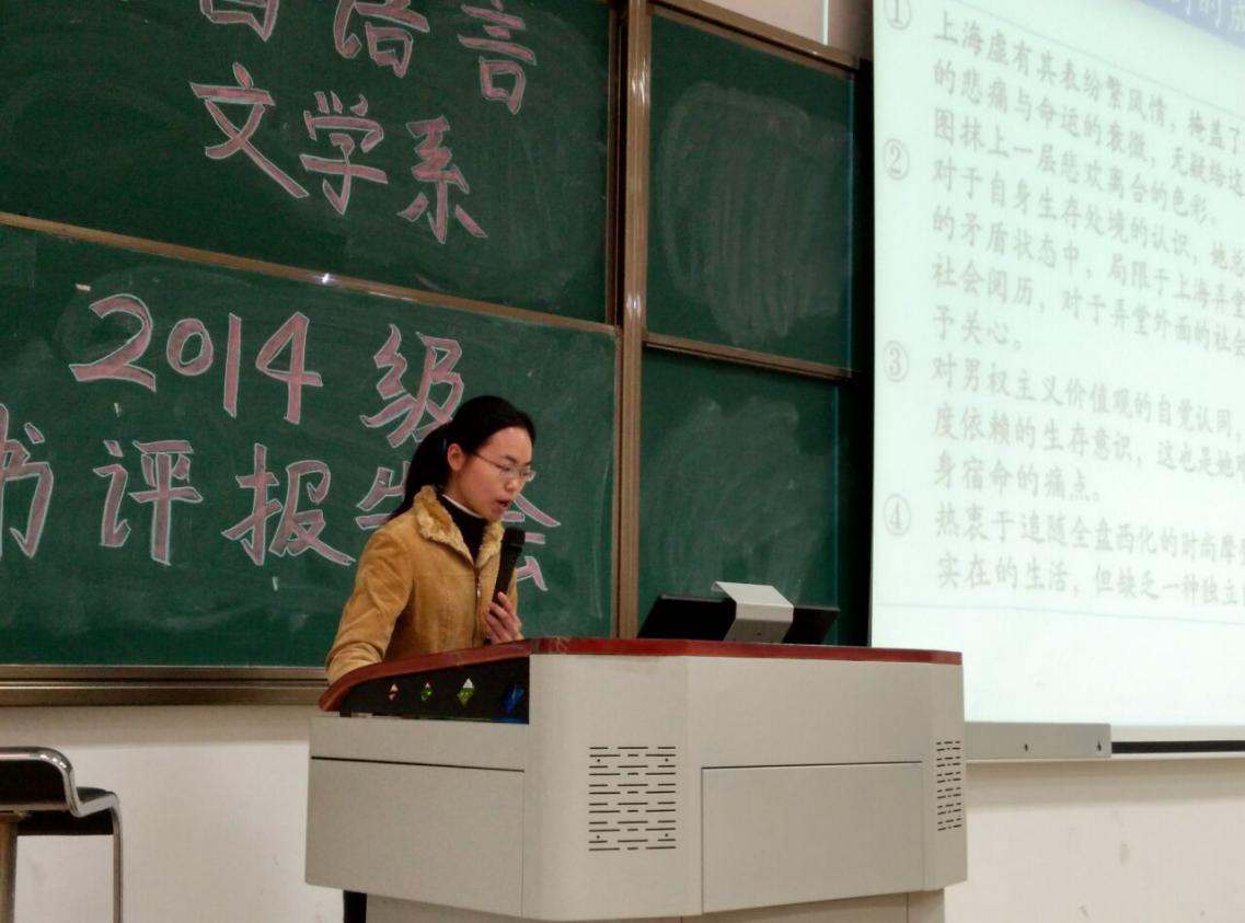其中,2014级B班的黄肇怡同学,其由程露老师指导的书评《城市的日常化“肖像”——评析< 长恨歌>中王琦瑶的命运》获得了老师们的一致好评。这篇书评不单单分析了具体的文本作品,更把人物放到大环境中来阐述,结合当时大上海的时代背景来进行探讨,整体结构清晰、观点鲜明。汇报过程中,镇定平静的神情,流畅生动的语言表达以及颇具创新的思维也让黄肇怡同学收获了全场同学的阵阵掌声。