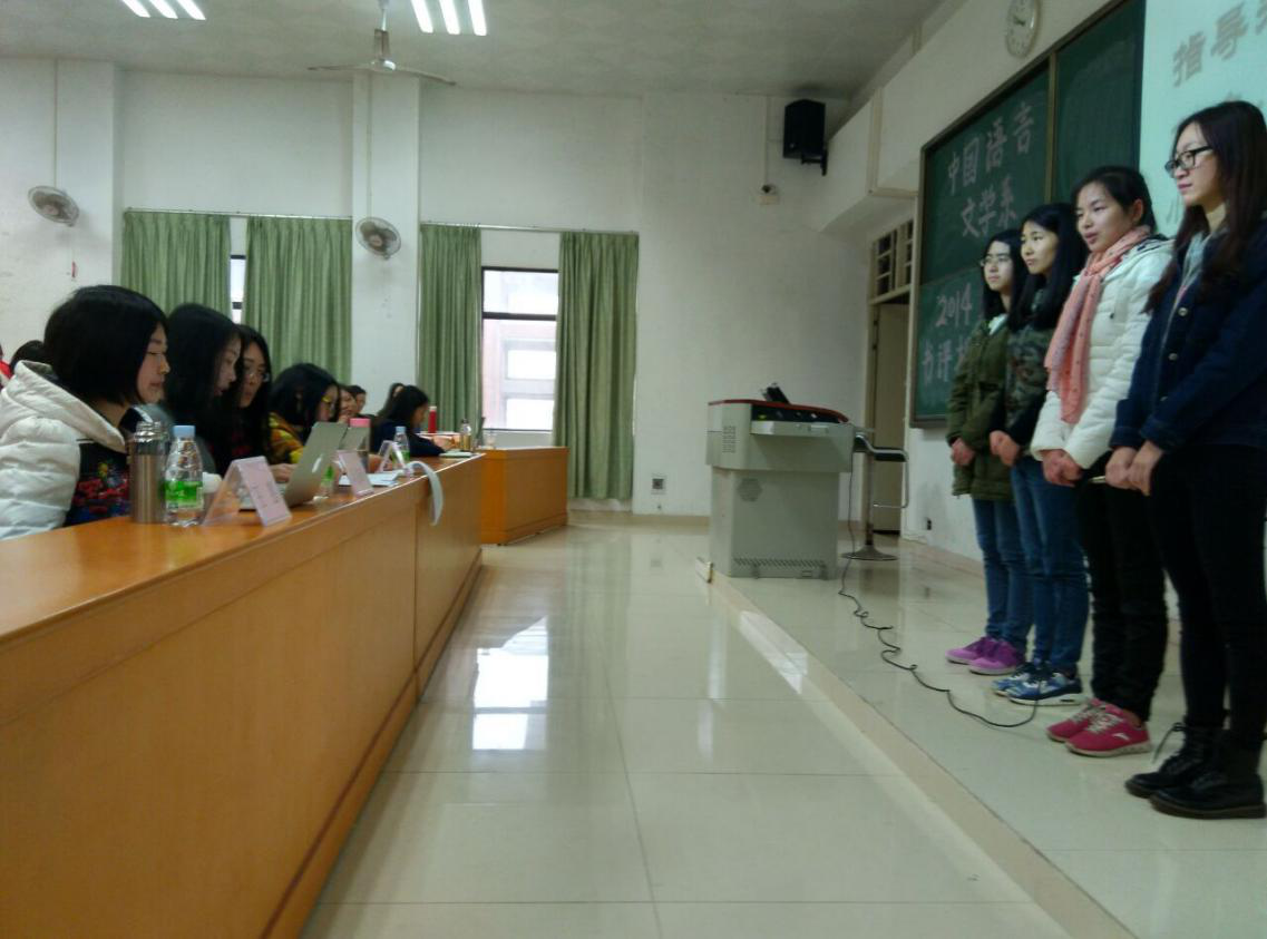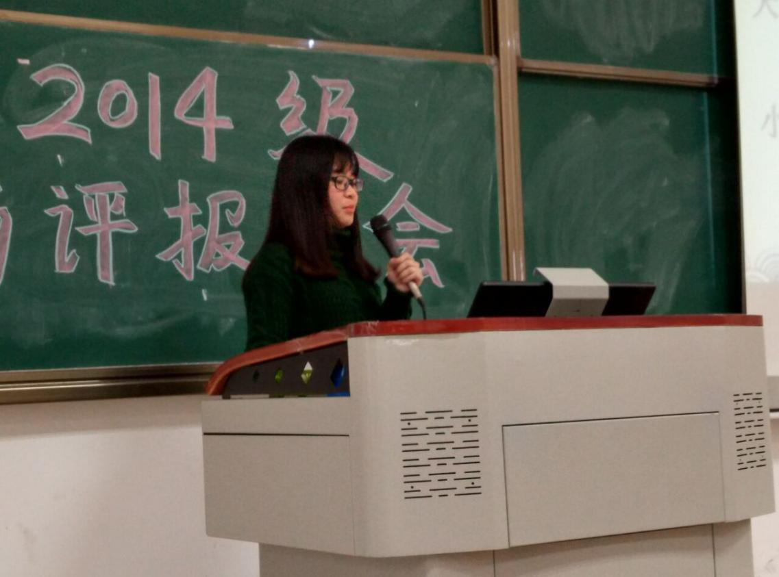 而同为2014级B班的罗绚同学,其作品是由邵言言老师指导的《从< 一地鸡毛>中理解新写实小说的写作特征》。她以幽默风趣的语言,自信从容的神态款款讲述论文思路,最后总结出:“鸡毛最重”,获得台下同学的热烈掌声,现场气氛十分和谐融洽。同时,罗绚同学简洁的文章架构给人一种舒服的感觉,逻辑思维清晰,书评选题准确恰当,受到老师们的普遍赞赏。