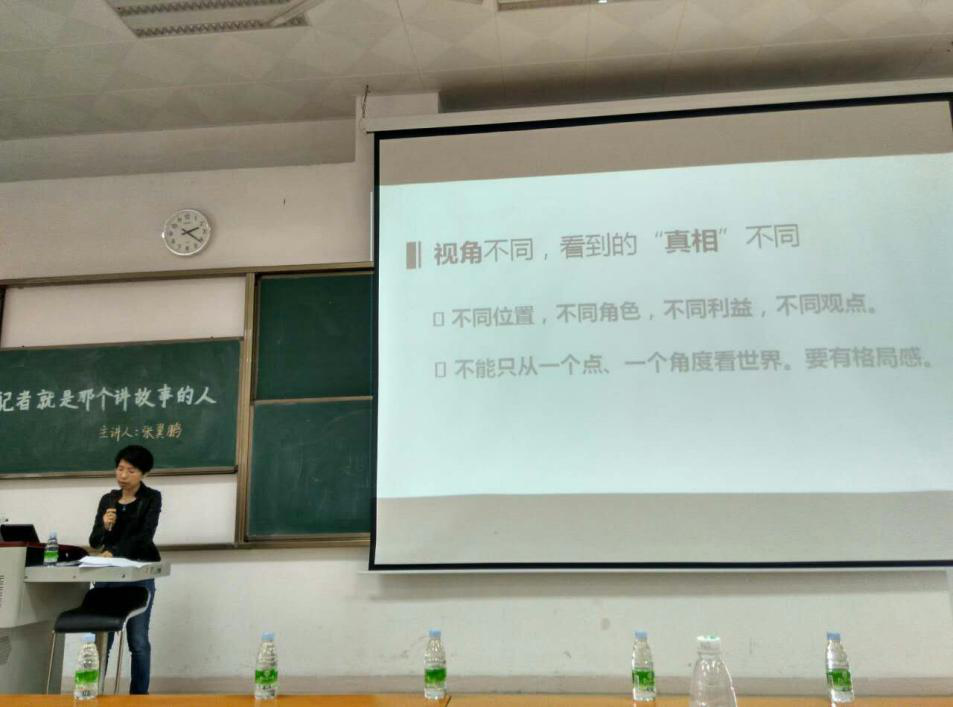 课上,张主编围绕“记者就是那个讲故事的人”这一主题给同学们论述记者的意义,从“记者为什么是讲故事的人”、“读者很重要”、“记者寻找真相”三个方面讲述记者行业背后的故事。