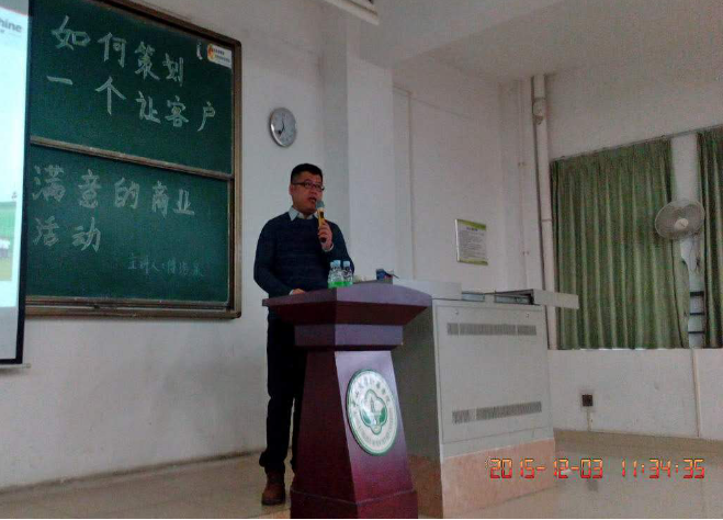 主讲人傅浩泉以“如何策划一个让客户满意的商业活动”为主题,给同学们介绍自己所在的公司的商业策划流程、如何与客户接洽沟通等,使同学们对商业策划有所了解。接着,他以自己所在的公司策划特色为例,总结出让客户满意的策划案形成条件。即,口碑良好、富有创意、性价比高、服务高效、让客户全程无忧等。