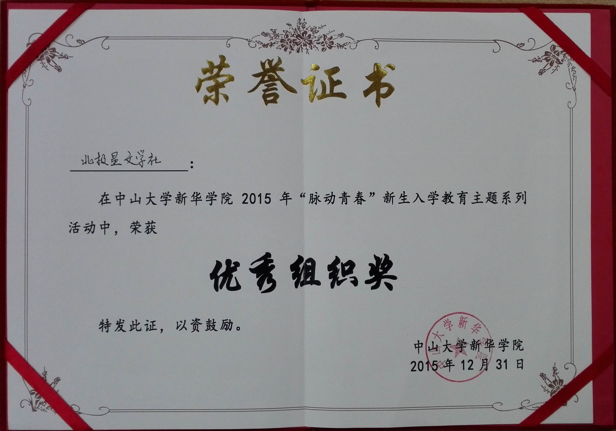 图2 系学生会张秀琪(左二)、北极星文学社蔡锦文(左三)上台领取“优秀组织奖”