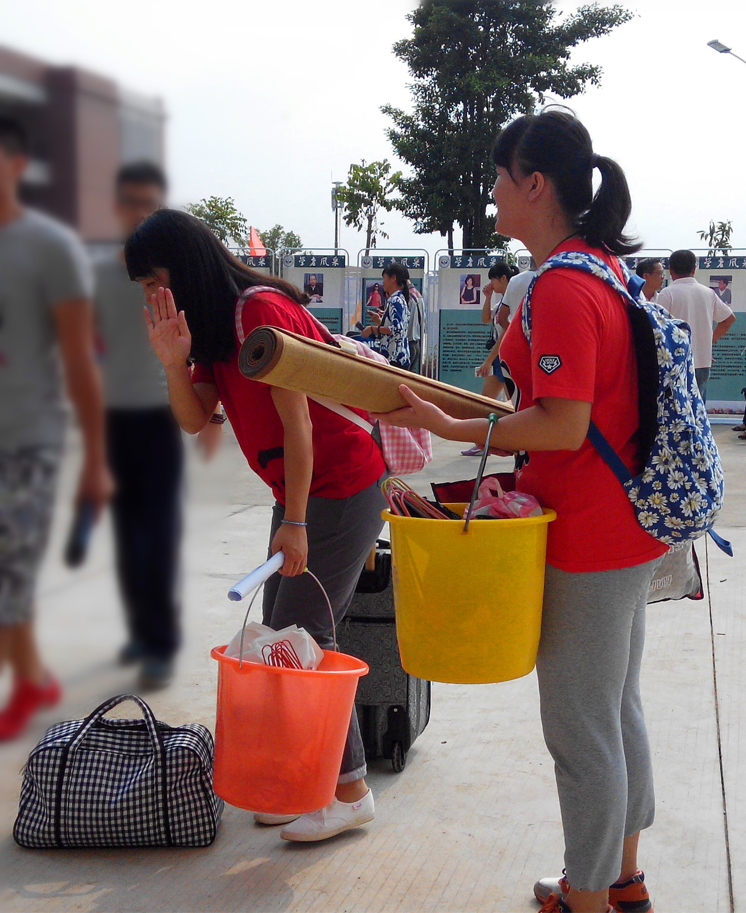 我穿着耀眼的红色系服,伫立在早晨七点的宿舍楼下,企盼你可能出现的身影。