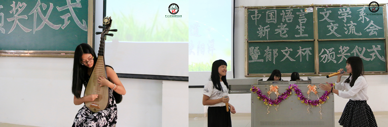 图3 左:新生黄泺谕弹奏琵琶;右:新生陈伟燕、欧阳洋合唱