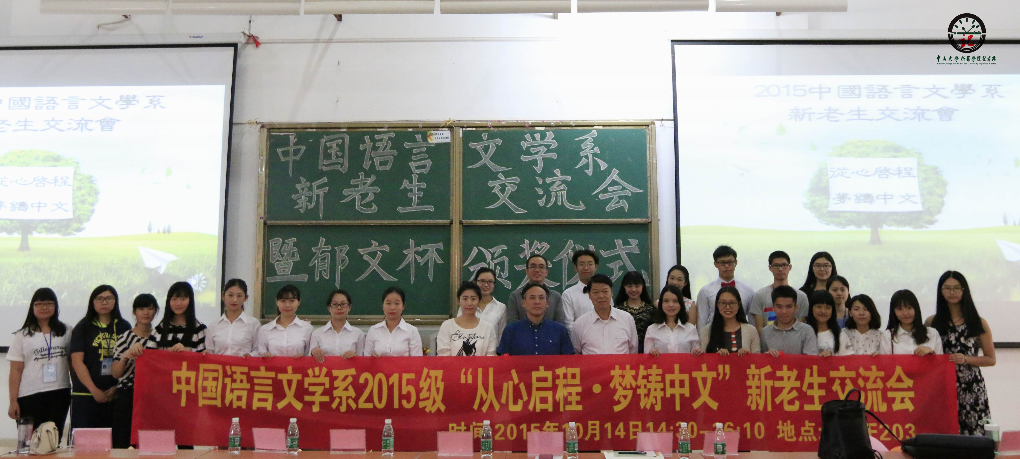 2015年10月14日14时30分—16时10分,为庆祝15级281名新生进入永利集团3044欢迎你这个大家庭,给刚上课的新生分享一些大学经验;同时,表彰第五届“郁文杯广东之‘名’”征文比赛获奖的同学,激励新生重视写作,永利集团3044欢迎你2015年“从心启程•梦铸中文”新老生交流会暨“郁文杯广东之‘名’”颁奖仪式在教①-F203举行。到场的嘉宾分别为李中生副院长、永利集团3044欢迎你副主任夏茵英副教授、副主任李铭建副教授、15级辅导员杨帮琰、15级级导师黄晓辉等老师代表及历届优秀学生代表以及全体新生。