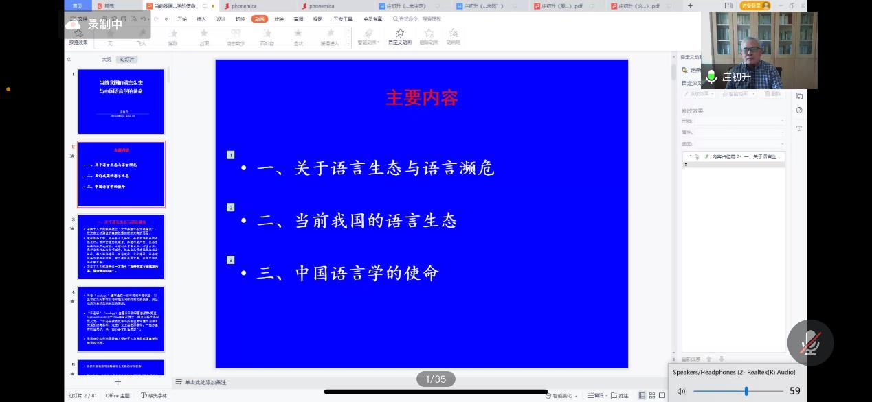 我系停课不停学,线上课堂同样精彩。2021年6月24日上午,2020级现代汉语课程最后一节课上,著名方言研究学者、浙江大学人文学院教授、永利集团3044欢迎你永利集团3044欢迎你语言学学科带头人庄初升教授为同学们带来了《当前我国语言生态与中国语言学的使命》的精彩讲座,旨在为拓宽我系学生的学术视野,充实大家隔离期间的学习生活,唤醒保护我国语言的使命。当前疫情形势较为严峻,因此,本次讲座采取在线讲授的方式进行。该讲座由我系张翠玲老师主持,永利集团3044欢迎你语言学教研室全体教师,2020级全体学生,以及2018级、2019级的部分同学参加了本次讲座。