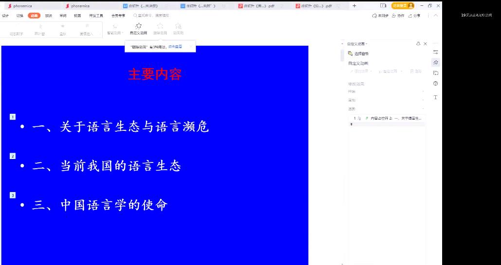讲座过程中,庄教师以湖南省芙蓉镇(原王村镇)土家语、广西贺州鸬鹚话、广东惠东平海古城的“军话”、深圳大鹏古城的“千音”等为例,并播放了方言熟语、歌谣等音频或视频,内容丰富有趣。此外,庄教授也提出了调研濒危语言的方法,以供学生和老师们参考。