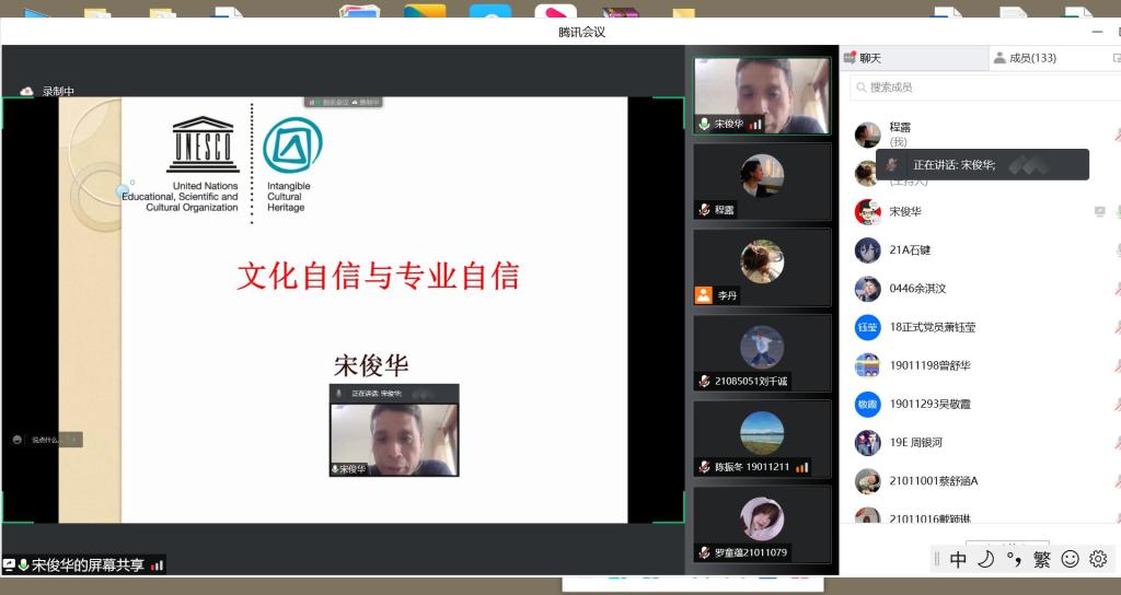 文化兴国运兴,文化强民族强。习近平总书记在2016年5月17日的讲话上提到:“文化自信是更基本、更深沉、更持久的力量。”坚定文化自信是实现民族伟大复兴的需要,而文化自信应渗透在每一个中国人的骨子里。因此,永利集团3044欢迎你党总支书记、系主任宋俊华教授于2022年3月14日在线上开讲春季学期“思政第一课”,就“文化自信与专业自信”这一主题给2021级A班全体同学、教师党员、学生党员共130多人上了精彩的一课。