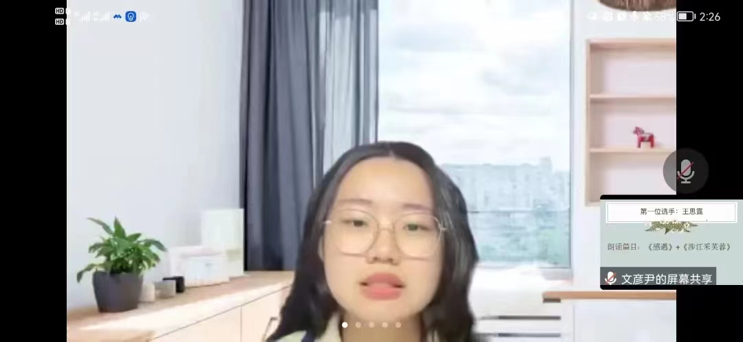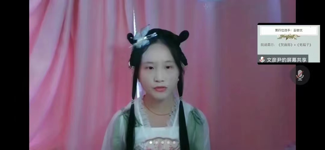 很荣幸能够参加古诗词朗诵大赛。中华的古诗词是文化的瑰宝,也唯有诗词能酬尽天地逆旅之间人生百态。愿借此比赛能将中华诗词之美娓娓道来。