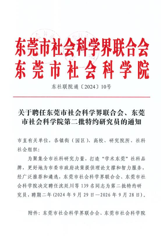 9月29日,东莞市社会科学界联合会、东莞市社会科学院发布《关于聘任东莞市社会科学界联合会、东莞市社会科学院第二批特约研究员的通知》(东社联院通〔2024〕10号),决定聘任沈廷川等139名同志为第二批特约研究员,聘期二年(2024年9月29日-2026年9月28日)。其中,我系宋俊华教授被聘为社会研究中心特约研究员,齐皓教授、程露副教授被聘为文化研究中心特约研究员。