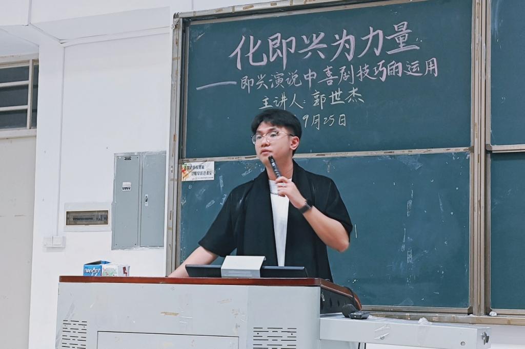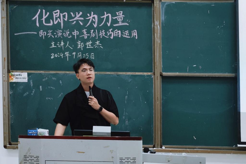 随后,由主讲人郭世杰围绕“什么是演讲”“什么是喜剧”“喜剧的格式”三个方面进行讲述。