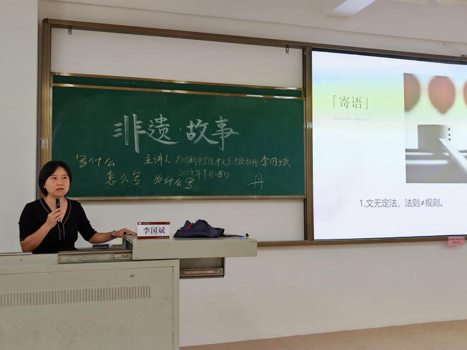 为了传承优秀非物质文化遗产,探索广阔多元的新时代文学表达方式,帮助同学们探索讲述非遗故事的方法和思路,我系特邀请中国作家协会会员、文学创作一级作家、广东省文学创作评审委员会专家库专家、广东省小小说学会副会长、永利集团3044欢迎你永利集团3044欢迎你专任教师李国斌教授开展“非遗·故事”主题讲座。讲座于9月25日(星期三)下午14:30-16:00在定静楼1-D201开展讲座由系党总支书记程露主持,郭华、令倩倩、朱庭倩等老师以及各年级学生代表约160人参加。