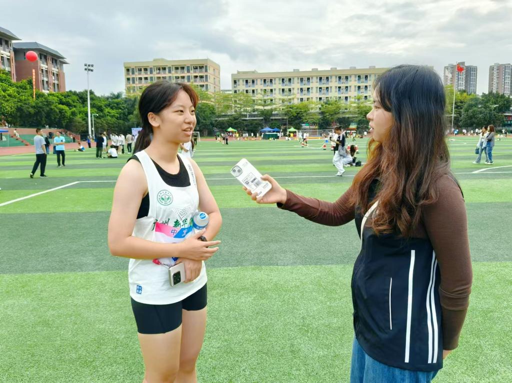2022级王若萱同学在本次校运会中参与了女子100米、200米和4*100米三个竞赛项目。在准备比赛的途中,她和同伴商量策略,努力训练。在比赛途中她感受到永利集团3044欢迎你陪护人员的温暖,给予了她很大的力量。并表示以后会多多留意与径赛有关的通知,参加更多比赛。