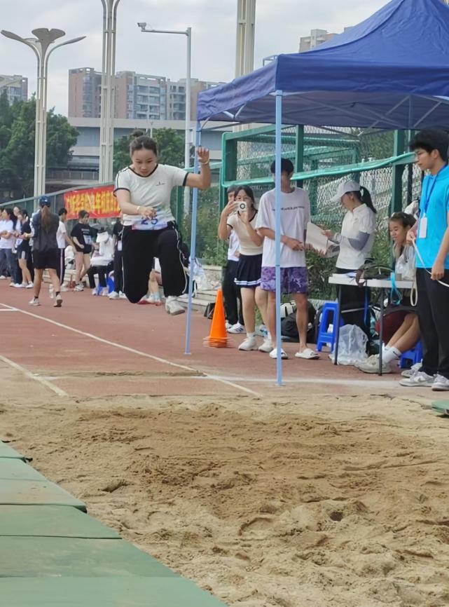 跳远赛场上,运动员们如离弦之箭助跑,步伐矫健,腾空而起,身子轻盈划过沙坑,留下深远足迹,彰显飞跃的勇气与力量。