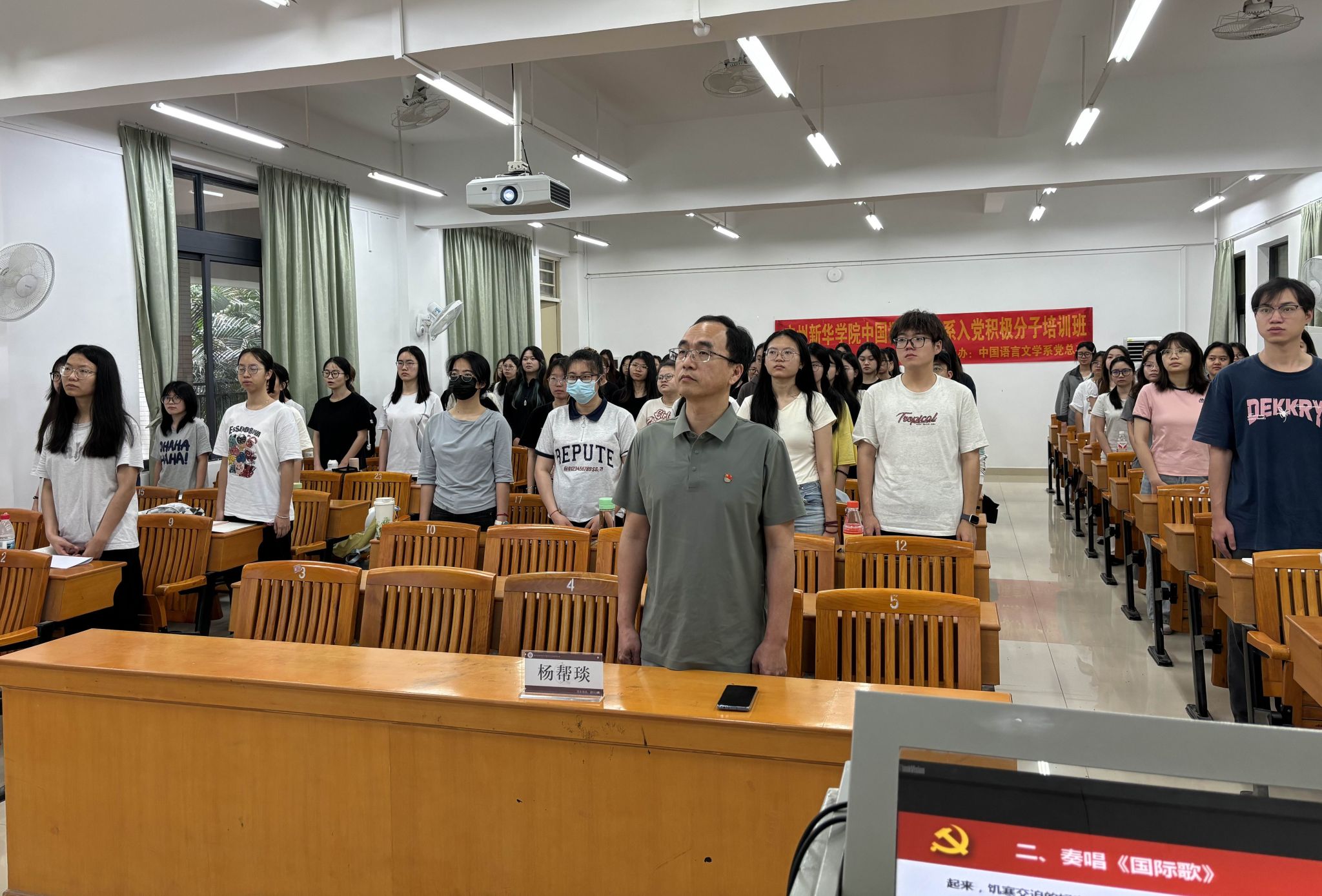 首先,在场人员在主持人的带领下共同奏唱《中华人民共和国国歌》《国际歌》。随后,杨帮琰副书记为培训班开班仪式致辞。他首先向参加培训班的全体学员表示了热烈的欢迎,并向协助组织培训班的工作人员表达了由衷的感谢。他指出,开展入党积极分子集中培训是发展党员工作的重要环节,是严谨的、严肃的,全体学员都要仔细阅读培训通知,清楚了解培训的各项要求,严格遵守学习纪律,以认真的态度和高质量的表现完成所有培训任务。他着重提出了三点要求学员们思考:一是“我为什么要入党”,入党虽是一份光荣,但更是一份责任,入党更多意味着“吃亏”,意味着付出、奉献,而爱戴、荣誉是奉献过程中带来的“副产品”。二是“我平时应该怎么做”,首先要明确“政治合格是首要标准”,“坚定不移听党话、跟党走”,然后是其它各方面表现优秀,如理论学习主动、成绩优良、无违纪考勤问题、有服务意识、主动参加科研项目等。三是“如何发挥我的模范带头作用”,要始终保持入党初心,坚持学思用贯通、知信行统一,确保真学、真懂、真信、真用,融入日常;要在“关键时刻站得出来”,率先垂范,比如在当前的学校本科评估工作、校园综合治理“百日攻坚”行动中,带头做好自己,并带动一批。最后,他希望大家通过此次培训,在思想、行动上顺利“双结业”!