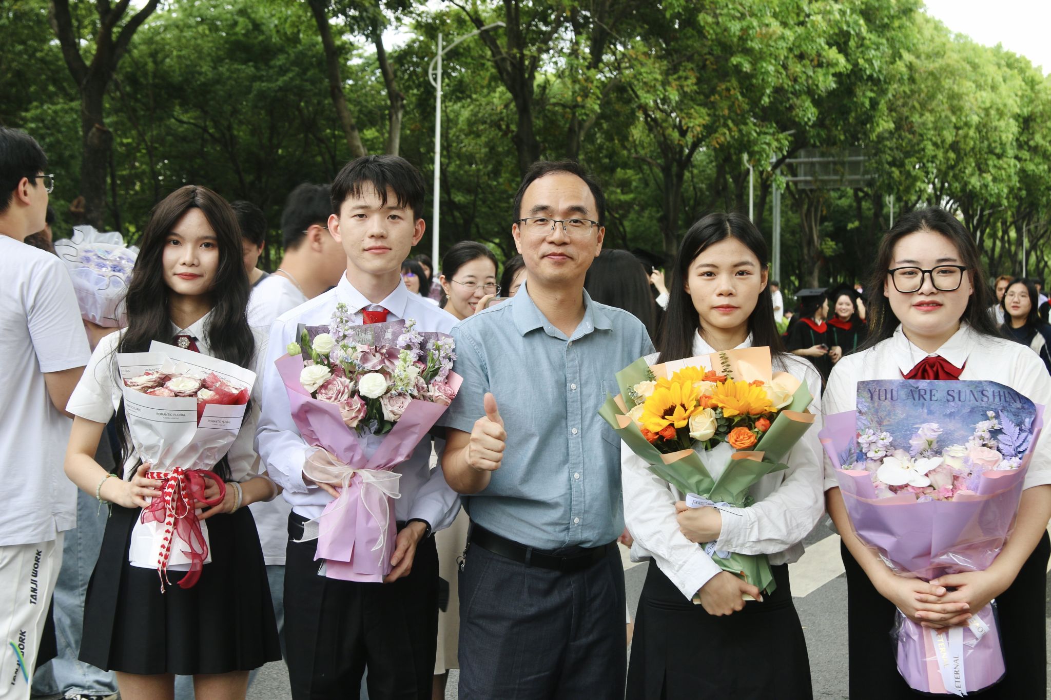 校园的花园中,繁花似锦,如同此刻大家心中满溢的情感。毕业生们与家长、老师相聚于此,一同定格这意义非凡的画面。老师们目光中满是欣慰与期许,家长们脸上洋溢着骄傲与不舍。毕业生们或挽着家长的手臂,或与老师并肩而立,笑容灿烂。这张合影,承载着多年来师长的悉心教导、家长的默默支持,成为青春记忆中最温暖的篇章。