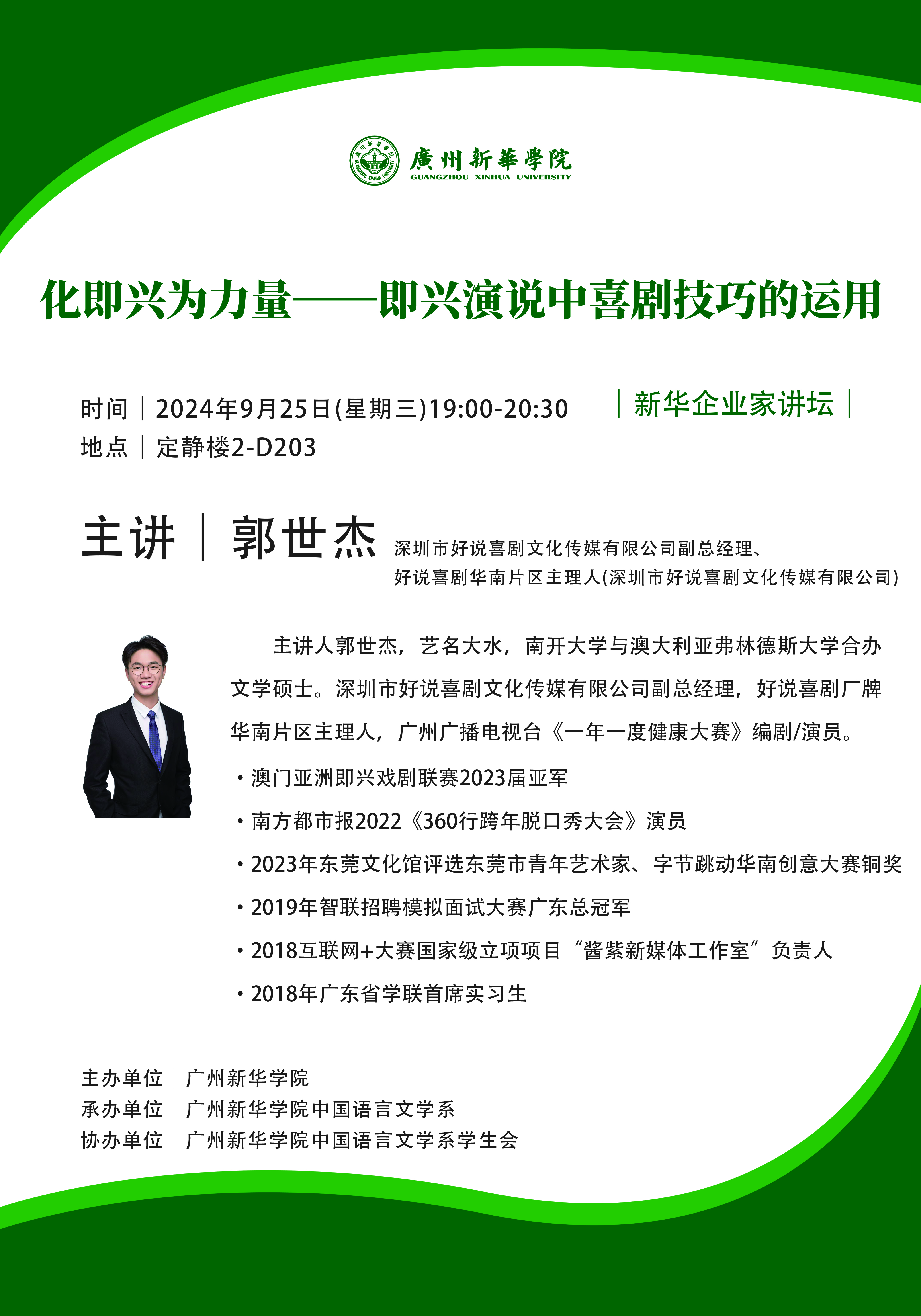主讲人:郭世杰(深圳市好说喜剧文化传媒有限公司副总经理、好说喜剧华南片区主理人)
