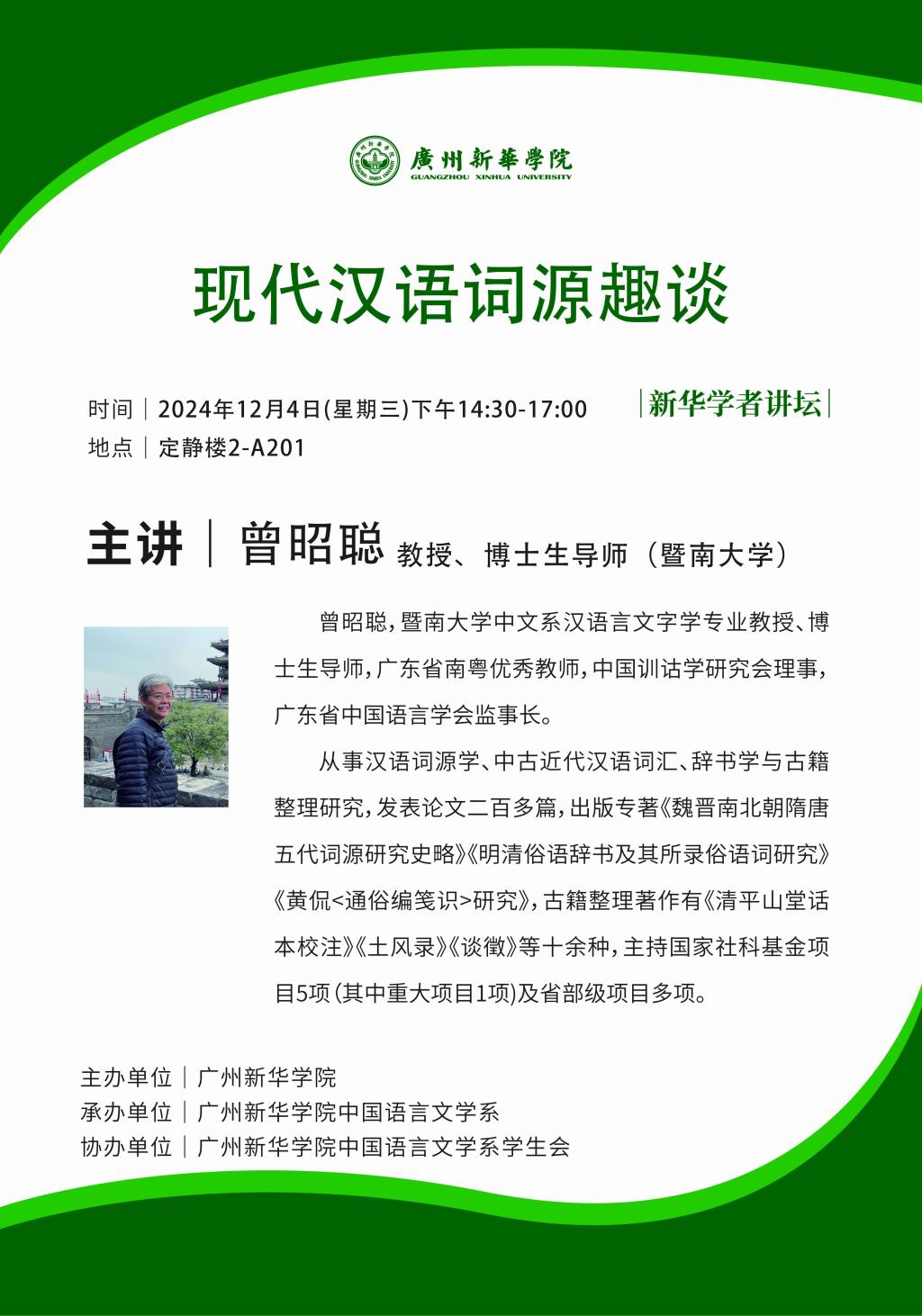 曾昭聪,暨南大学永利集团3044欢迎你汉语言文字学专业教授、博士生导师,广东省南粤优秀教师,中国训诂学研究会理事,广东省中国语言学会监事长。从事汉语词源学、中古近代汉语词汇、辞书学与古籍整理研究,发表论文二百多篇,出版专著《魏晋南北朝隋唐五代词源研究史略》《明清俗语辞书及其所录俗语词研究》《黄侃〈通俗编笺识〉研究》,古籍整理著作有《清平山堂话本校注》《土风录》《谈徵》等十余种,主持国家社科基金项目5项(其中重大项目1项)及省部级项目多项。